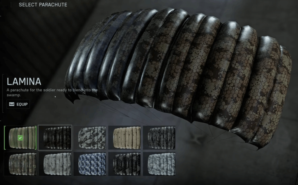 Jednym z dostępnych wariantów jest „Lamina” — model stworzony z myślą o kamuflażu w terenach bagiennych i wilgotnych, o ciemnym, sześciokątnym wzorze maskującym. Obok niego znajdziemy również klasyczne schematy urban, desert czy digital camo, które można odblokować poprzez postęp w sezonie lub określone wyzwania.
