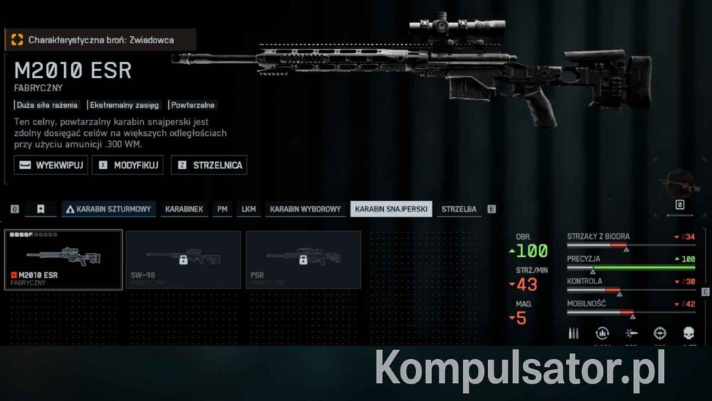 Ten karabin snajperski wyróżnia się ekstremalnym zasięgiem i niesamowitą precyzją. Strzela ciężkimi nabojami .300 WM, które zachowują energię nawet przy dużych odległościach. Dzięki temu M2010 ESR to broń stworzona do dominacji na otwartych mapach, zwłaszcza w trybach Zwiadowca i Conquest.
