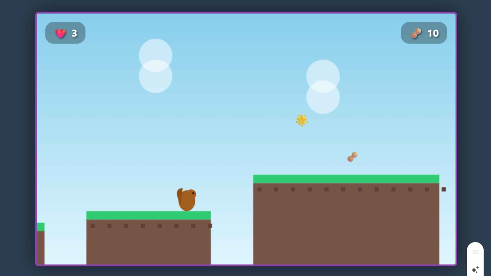 Stwórz grę typu MARIO ale postacią pokonującą przeszkody ma być Wiewiórka, ma zbierać orzeszki , co kilka minut jeden złoty orzeszek zmieniający atak na lepszy z większym efektem wizualnym i dmg, 3 życia i od nowa – atakujące robaki, przeszkody i przepaście – poziom LATWY.